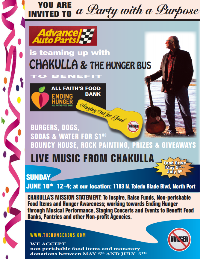 Fundraiser Concert: “Party with a Purpose”! Advanced Auto on 1183 N. Toledo Blade Blvd. in North Port, Florida is teaming up with the Hunger Bus having a Party to Benefit: the All Faiths Food Bank! Burgers, Dogs, Sodas and Water all for a dollar donation each. Bouncy House, Rock Painting, Prizes and Give aways. Family Fun and celebration! Chakulla will be making Music throughout afternoon! This Event is FREE! Monetary and non-perishable Donations excepted! Help Feed Hungry Children/People!